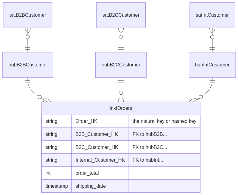 We already have Hubs and Satellites for Vendors (b2b customers) and Customers (b2c/d2c customers) from other source tables.